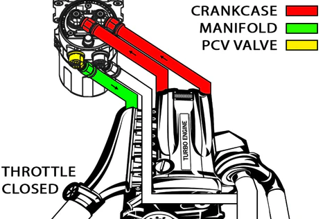 As shown, a PCV valve can be used with a VTE catch can to keep negative pressure in the crankcase at all times. The diagram below is specific to when the throttle is closed.