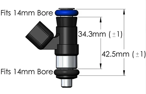 Universal fuel injectors with the dimensions shown below are required when installing this fuel rail. The injectors must have this 34mm height with 14mm o-rings.